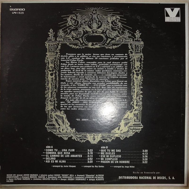 Es innegable, que es un disco con mucha calidad, muy apetecible desde todo punto de vista, tanto en lo orquestal (arreglos y músicos), como en la escogencia de los temas y en las condiciones de DON FELIPE PÍRELA para ese momento.