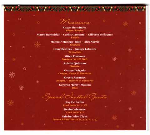 Saxofón barítono y flauta: MITCH FROHMAN, en el bajo: JERRY MADERA, los bongos y el güiro a cargo de ORESTE ABRANTES, en el cuatro puertorriqueños EDWIN COLÓN ZAYAS, en las congas GEORGE DELGADO, en los trombones DOUG BEAVERS y JUANGA LAKUNZA, trompetas ALEX NORRIS, y paremos de contar. Definitivamente un plantel de lujo.